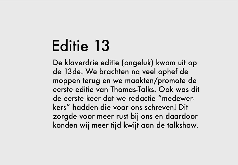 Editie 1 en 23 zijn niet te vergelijken dit komt omdat wij zelf nog vrij weinig van typografie afwisten en wij hierdoor iets compleet nieuws moesten leren. Persoonlijk merk ik dat er een enorme groei is geweest en dat ik zonder dit project veel minder vertrouwen in mijn eigen werk zou hebben dan nu.