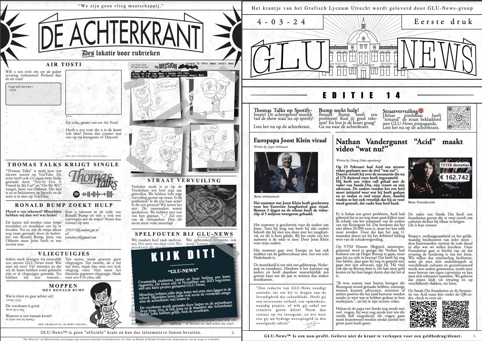 Nu ik op stage ga is de krant overgenomen door 2 mensen die ons al hielpen achter de schermen. Wij hopen dat GLU-News blijft bestaan zelfs al zijn wij al jaren van de school af: