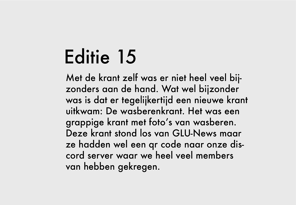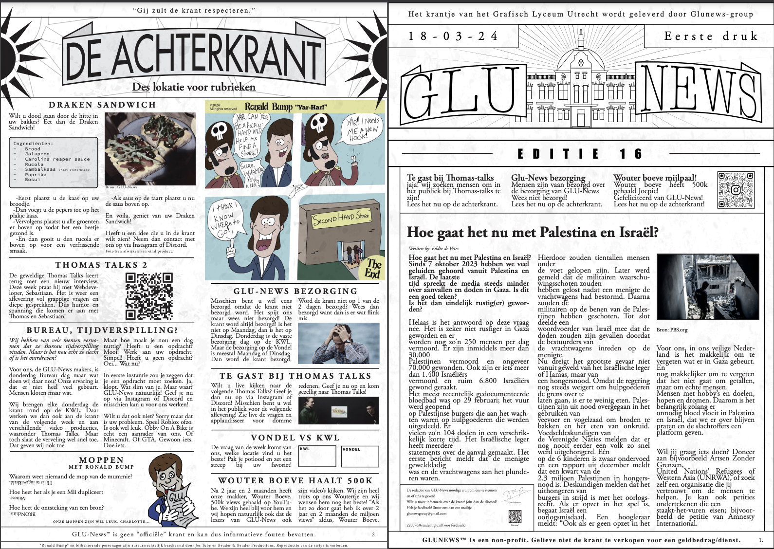 Wij hadden op het moment niet veel te doen en dus besloten we daar een verandering in te maken: We hadden een project nodig waar we nieuwe dingen van zouden leren en inspiratie uit konden halen, dit werd GLU-News. Het begon als een krant maar het groeide uit naar iets groots: Van talkshows tot het maken van een podcast werken we nu aan verschillende projecten binnen ons krantje. We hebben op het moment meerdere "medewerkers" die ons helpen met het uitbrengen van de wekelijkse krant en shows, ook hebben we eindelijk de 100 volgers aangetikt en heeft onze discord 80 actieve leden die ons feedback geven en we samen mee de krant proberen te verbeteren.